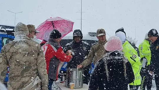 Elazığ'da etkili olan kar yağışı halen devam ederken, jandarma ve emniyet ekipleri yolda kalan araçlara zincir takarak vatandaşlara çorba ikramında bulundu.