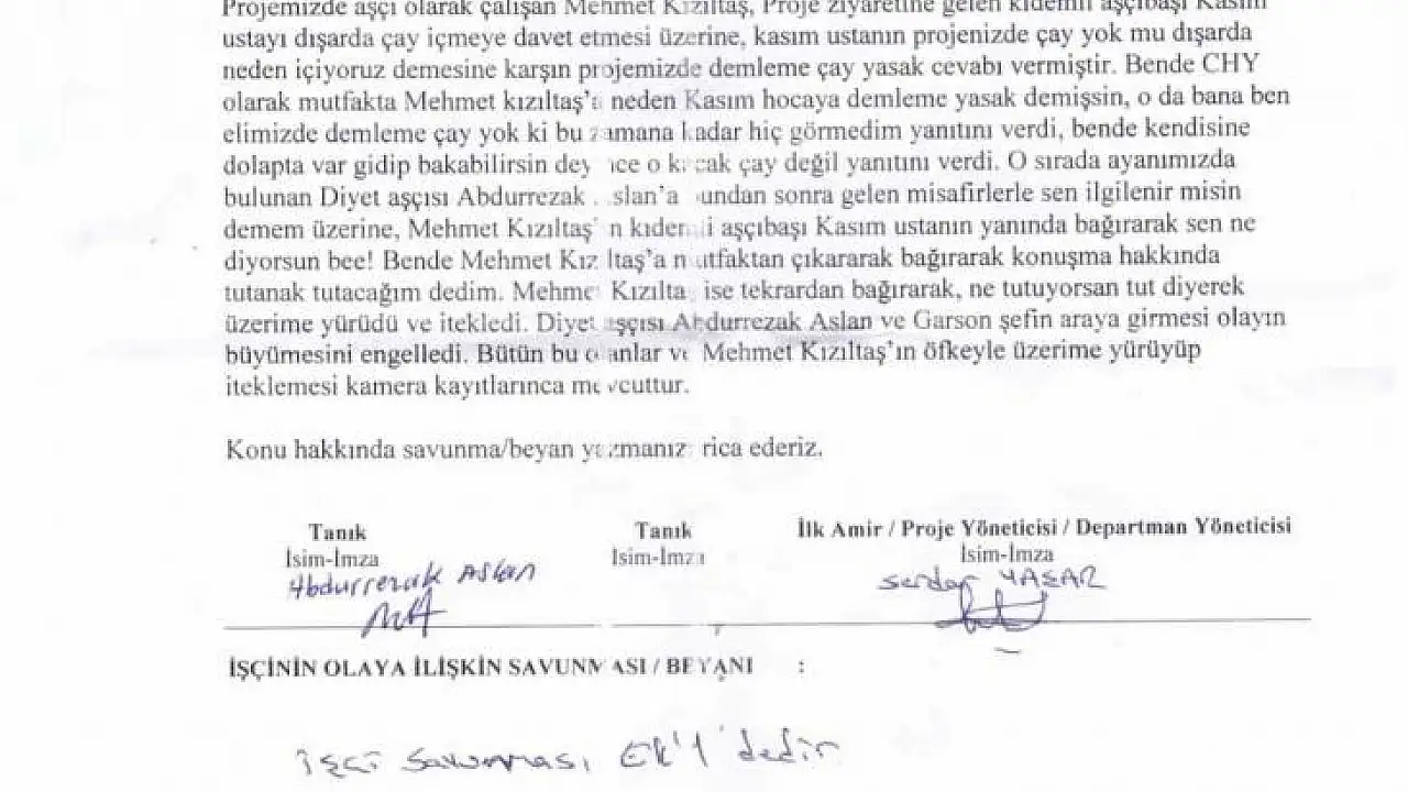 Avukat Hanifi Kandemir tarafından mahkemeye sunulan dilekçede, müvekkili Kızıltaş’ın 20 Haziran 2013’te davalı şirkette aşçı olarak çalışmaya başladığı, iş akdinin 19 Ekim 2021’de feshedildiği belirtildi.