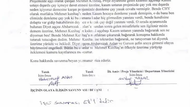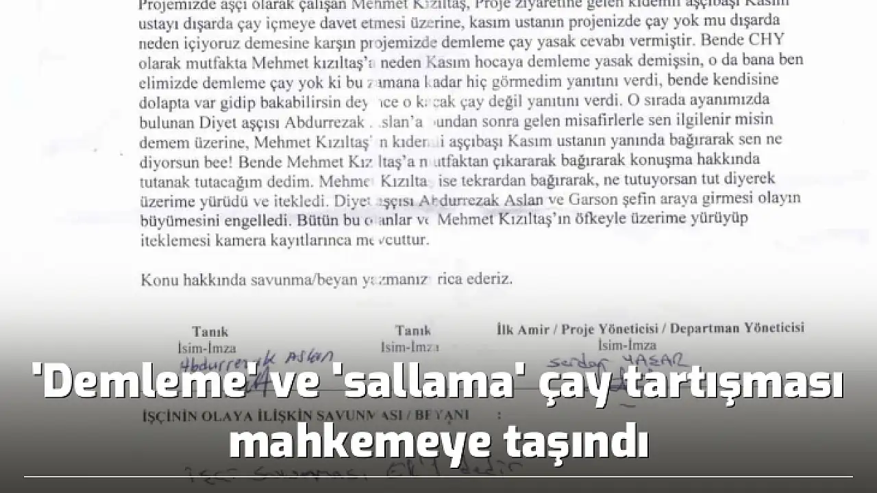 Olay günü yöneticisinin çayın demli olmaması ve hazır sallama çay kullanılması nedeniyle Kızıltaş’ı azarladığı iddia edilen dilekçede, "Müvekkil, yöneticiye gündüz talimat gereği demleme çay yapılmadığını söylemiştir. Buna rağmen müvekkil azarlanmasına ve iş akdinin feshedilmesi tehdidine rağmen hakaret ve fiziki müdahalede bulunmadan tepkisini göstermiştir. Böyle basit bir mevzu için çocuk gibi azarlanıp tahrik edilen müvekkilin iş akdi feshedilmiştir. Yasayla belirlenmiş herhangi bir iş akdinin feshi yokken bu şekilde iş akdinin feshedilmesi hukuka aykırıdır. Haksız şekilde işten çıkarılan müvekkilin işine dönmesi için işe iade davası açma mecburiyetimiz doğmuştur" ifadelerine yer verildi.