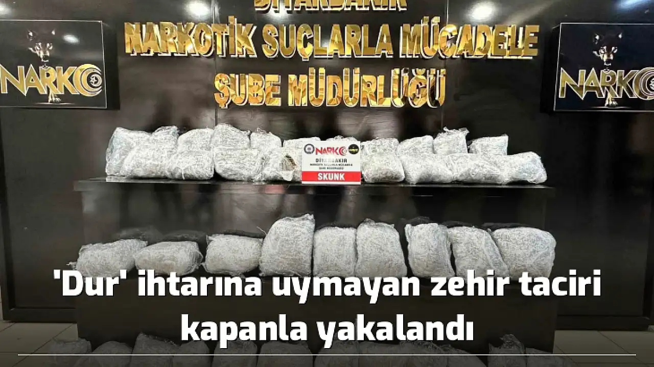 Diyarbakır'da polisin 'dur' ihtarına uymayarak kaçan zehir tacirinin kullandığı otomobil, ekiplerin kapan atması sonucu lastikleri patlatılarak durduruldu. Otomobildeki 1 kişi, 44 kilogram uyuşturucu maddesiyle yakayı ele verdi.