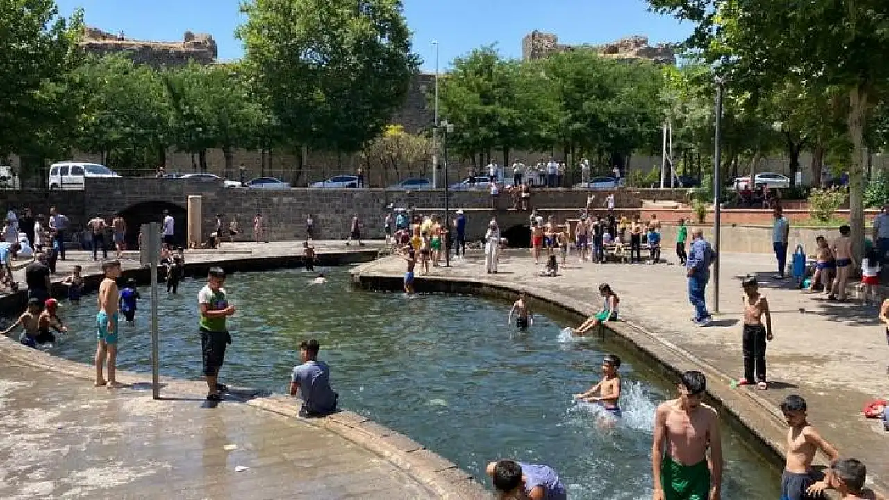 43 dereceyi gören Diyarbakır'da çocuklar süs havuzuna koştu