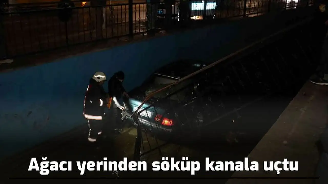Malatya'da sürücüsünün kontrolünden çıkan araç çarptığı ağacı yerinden söküp demir korkulukları aşarak su kanalına uçtu.