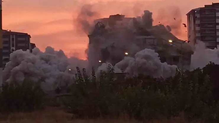 Ağır hasarlı 13 katlı bina saniyeler içerisinde yıkıldı