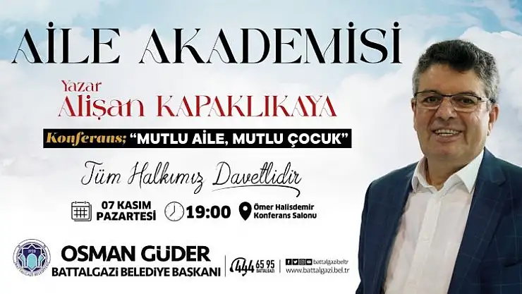 Eğitimci-Yazar Alişan Kapaklıkaya, Malatya Battalgazi Belediyesi tarafından ailelere rehberlik etmesi amacıyla hayata geçirilen “Aile Akademisi” programları çerçevesinde Battalgazililerle buluşuyor. 7 Kasım Pazartesi günü saat: 19.00’da Şehit Ömer Halisdemir Konferans Salonu’nda düzenlenecek olan programda Yazar Kapaklıkaya, teknoloji ile aile arasındaki bağları Battalgazililerle paylaşacak.