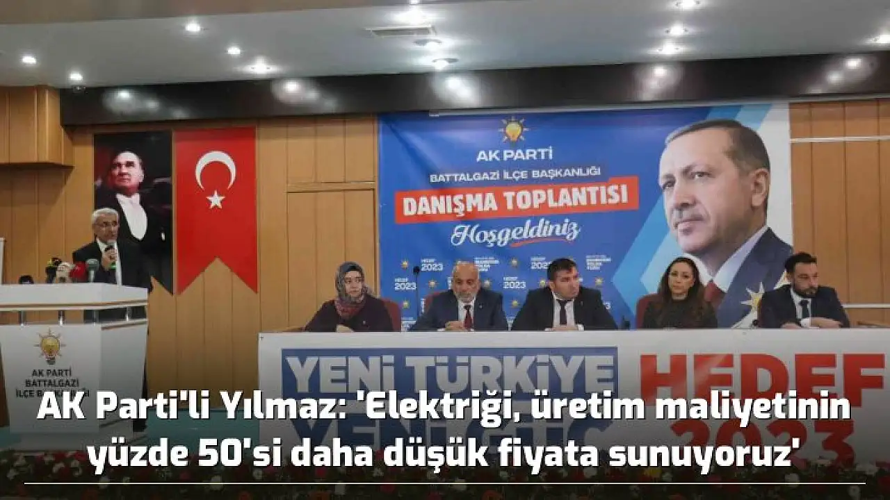 MALATYA (İHA) – Malatya'da AK Parti Battalgazi İlçe Danışma Meclisi Toplantısı, AK Parti Grup Başkanı İsmet Yılmaz'ın katılımıyla gerçekleşti. Yılmaz, elektriği üretim maliyetinin yüzde 50'i daha düşük fiyata sunduklarını söyledi.