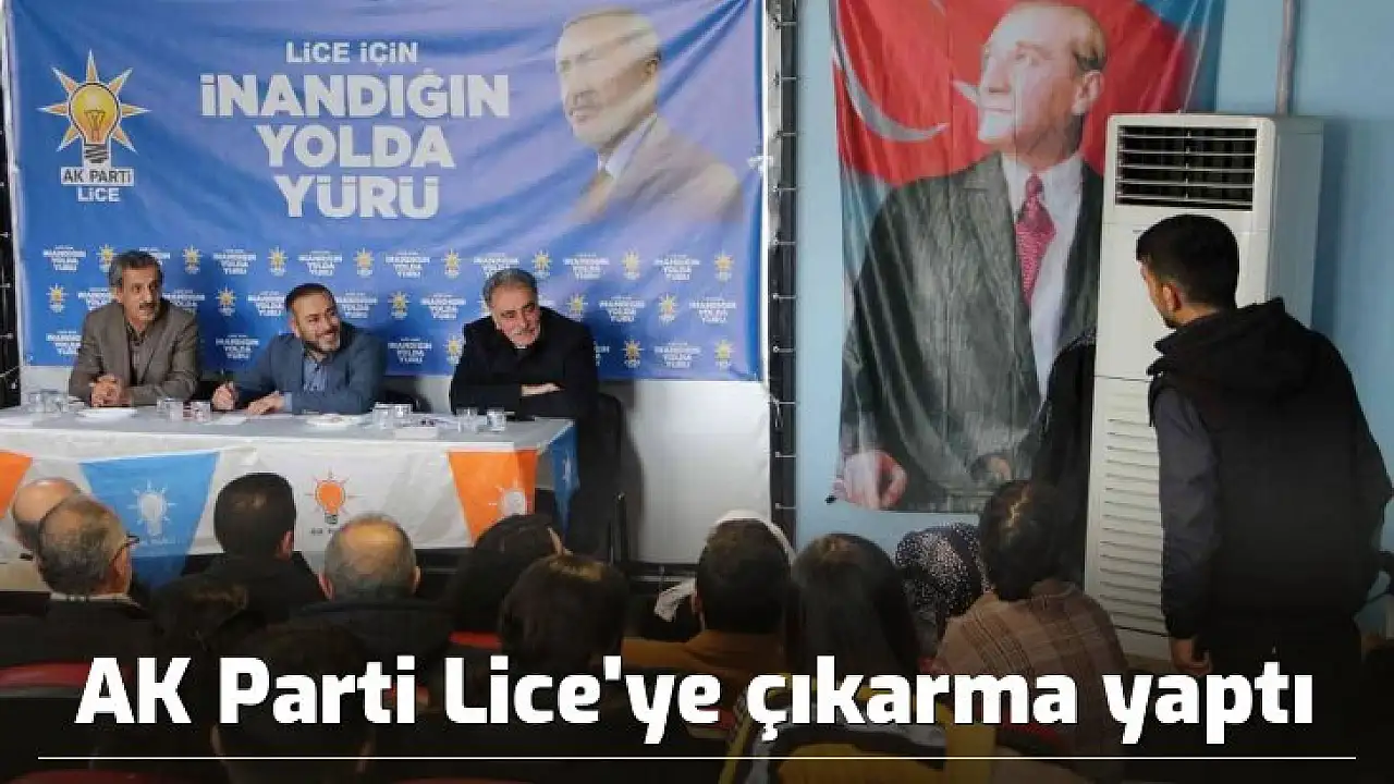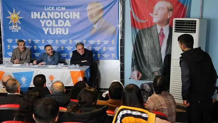 Lice İlçesinde Sivil Toplum Kuruluşları (STK) ve kanaat önderleri ile bir araya gelerek sorun ve talepleri dinleyen AK Parti heyeti, ardından Lice AK Parti teşkilatının ana kademe, kadın kolları, gençlik kolları ve belediye meclis üyeleri ile bir araya gelerek 3 kademe teşkilat istişare ve değerlendirme toplantısı gerçekleştirdi. Heyet, daha sonra vefa buluşması programında Lice ilçesinde AK Partinin kuruluşundan bu yana görev almış olan tüm ilçe başkanları, kadın kolları başkanları, gençlik kolları başkanları, belediye başkan adayları, geçmiş belediye meclis üyeleri, geçmiş dönemlerde görev alan yönetim kurulu üyeleri ile bir araya geldi.