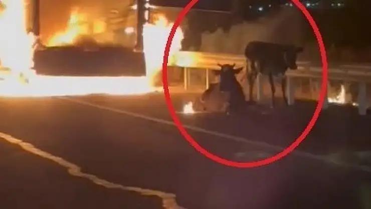 Alev topuna dönen kamyonetin arkasında inekler istifini bozmadan oturdu