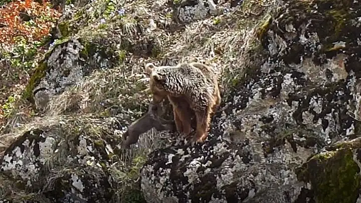 Tunceli'de anne ve yavru boz ayı görüntülendi. Anne ayının yavrusunu zorlu yerlerde ağzıyla taşıması dikkat çekti.