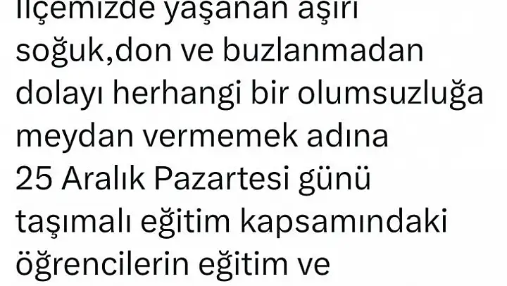Yedisu ve Adaklı Kaymakamlıkları tarafından yapılan açıklamada, 'İlçemizde yaşanan aşırı soğuk, don ve buzlanmadan dolayı herhangi bir olumsuzluğa meydan vermemek adına 25 Aralık Pazartesi günü taşımalı eğitim kapsamındaki öğrencilerin eğitim ve öğretimine 1 gün süreyle ara verilmiştir' denildi.