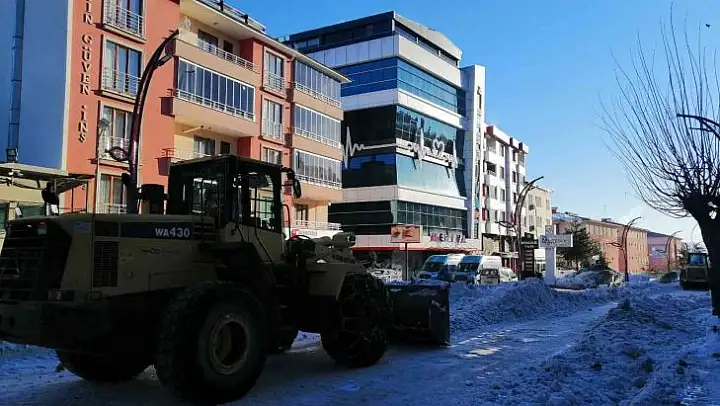 Kepçe ve greyder desteğiyle toplanan kar, kamyonlarla şehir merkezine dışına taşınırken, işçiler de yaya yollarında çalışmalara devam ediyor.