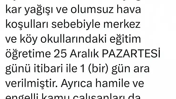 Bingöl'ün Adaklı, Yedisu ve Karlıova ilçelerinde taşımalı eğitime ara verilmişti. Kiğı Kaymakamlığı tarafından yapılan açıklamada da yarın taşımalı eğitime ara verildiği belirtildi. Açıklamada, 'İlçemizde devam eden yoğun kar yağışı ve olumsuz hava koşulları sebebiyle merkez ve köy okullarındaki eğitim öğretime 25 Aralık Pazartesi günü itibari ile 1 gün ara verilmiştir. Ayrıca hamile ve engelli kamu çalışanları da idari izinli sayılacaklardır' denildi.