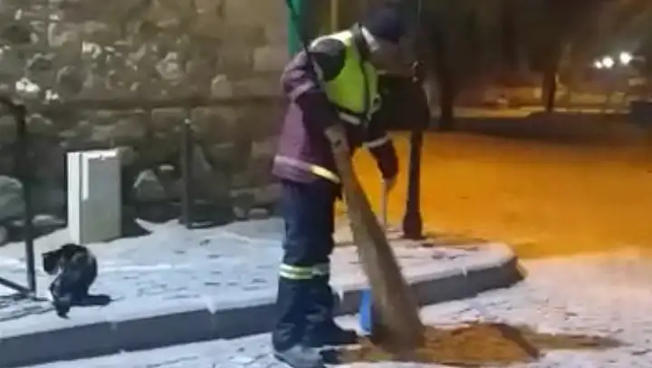 Elazığ'ın tarihi mahallesi Harput'ta temizlik görevlisi olan Metin Demirtaş, 2 yıl önce bir sokak kedisi ile dostluk kurdu. Kedi her sabah saat 6'da otobüs durağının önüne gelerek Demirtaş'ı bekliyor. Demirtaş da her sabah işe başlamadan önce kediye süpürgesi ile mesaj yapıyor. Ardından işe başlayan Demirtaş'ın yanından kedi bir an olsun ayrılmıyor. O anları Harput Mahalle Muhtarı Zülküf Demirpolat, cep telefonu kamerası ile çekerek sosyal medyaya yükledi.