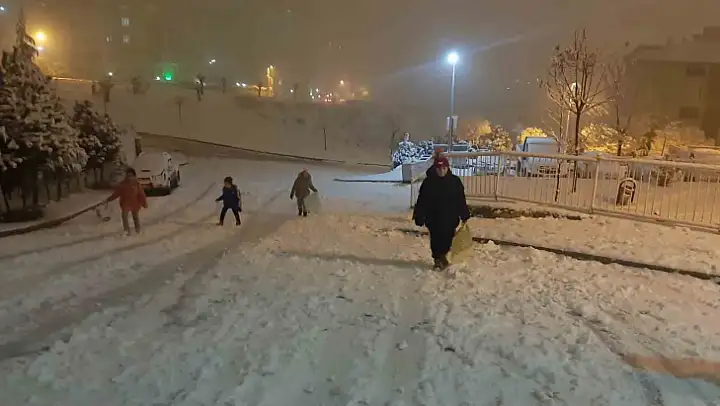 Elazığ'da uzun bir aradan sonra tekrar yağan kar en çok çocukları sevindirdi. Gecenin bir yarısı ellerine aldıkları poşetlerle karda kayan çocukların kar yağışı ile ilgili sözleri tebessüm ettirdi.
