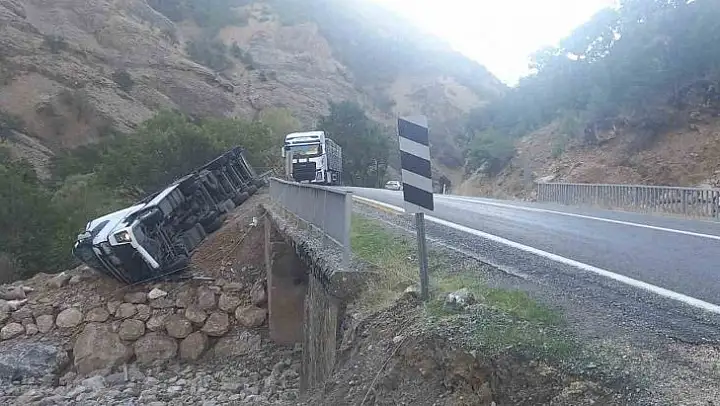 Tunceli-Erzincan karayolunda virajı alamayan tır devrildi. Kazada sürücü yaralandı.