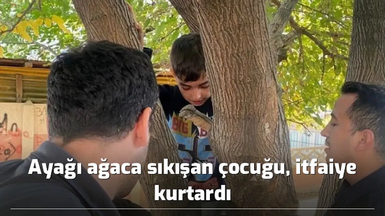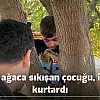 Ayağı ağaca sıkışan çocuğu, itfaiye kurtardı