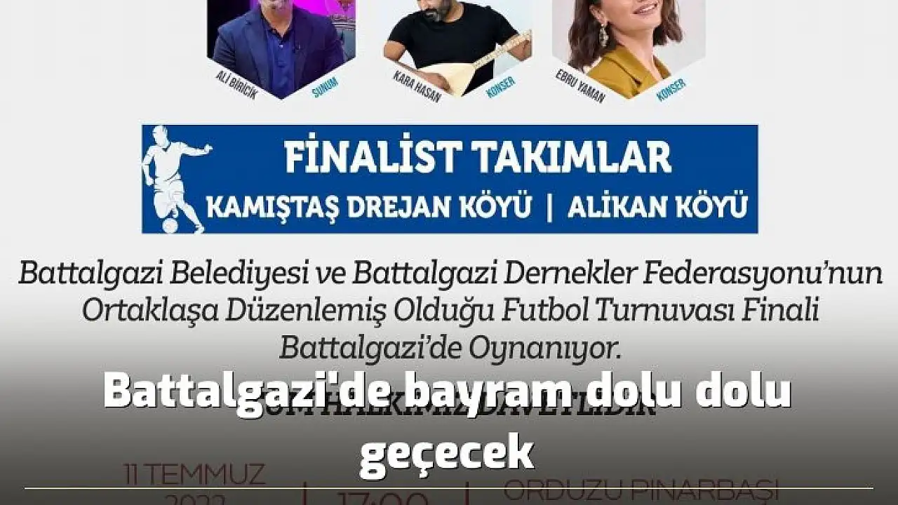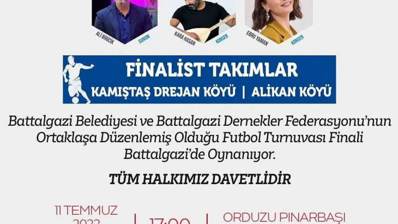Battalgazi Belediyesi ve Battalgazi Dernekler Federasyonu tarafından “Bekir Alyüz Futbol Turnuvası”nın finali ve mini bir konser programı düzenlenecek. 11 Temmuz Pazartesi günü saat: 17.00’de Orduzu Pınarbaşı Tesisleri’nde Kamıştaş Drejan Köyü ile Alikan Köyü takımlarının oynanacağı futbol turnuvası final müsabakasının ardından, Orduzu Pınarbaşı Yeni Malatyaspor tesislerinde yapılacak olan ve sunuculuğunu Ali Biricik’in üstleneceği konser programında yerel sanatçı Ebru Yaman ve Kara Hasan sahne alacak. En güzel şarkılarını Malatyalılar için seslendirecek olan sanatçılar, programa katılacak vatandaşlara unutulmaz bir gece yaşatacak. Oynanacak olan final müsabakası ve ücretsiz konser programı ile Malatyalı vatandaşlar, Kurban Bayramını dolu dolu geçirecek.