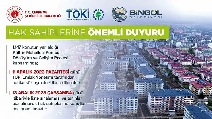 11 Aralık 2023 Pazartesi günü banka sözleşmeleri ilan edilecek. Hak sahipleri, 13 Aralık 2023 Çarşamba günü itibariyle liste sıralaması ve tarihler baz alınarak hak sahiplerine konutlar teslim alabilecek. Belediyeden yapılan açıklamada, bin 147 konut ve 190 iş yerinin yer aldığı proje çerçevesinde 11 Aralık 2023 Pazartesi günü TOKİ Emlak Yönetimi tarafından banka sözleşmelerinin ilan edileceği ifade edildi. Açıklamada, "13 Aralık 2023 Çarşamba günü itibariyle liste sıralaması ve tarihler baz alınarak hak sahiplerine konutlar teslim edilecektir. Emlak Yönetimi tarafından yapılacak ilanda belirtilen evrakları ve sözleşmeleri tamamlayarak, listedeki tarih ve sıralamanıza göre anahtarlarınızı TOKİ Konut alanında bulunan Emlak Yönetimi Ofisinden teslim alabilirsiniz. Hak sahipler, ilgili listelere belediyemizin resmi web sayfası üzerinden ulaşabilirler" denildi.