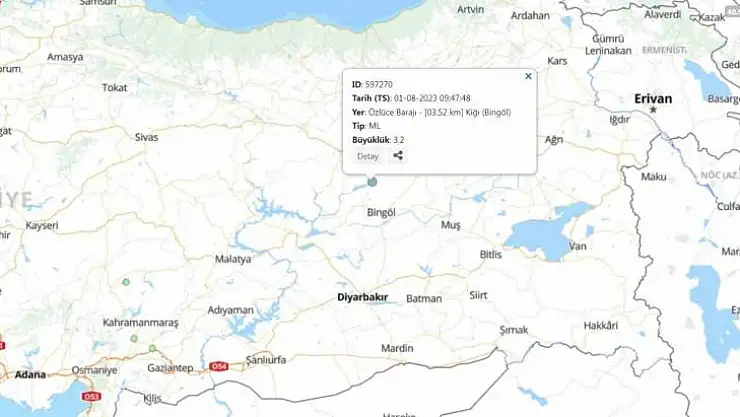 Merkez üssü Bingöl'ün Kiğı ilçesine bağlı Özlüce Barajı mevkiinde 3,2 büyüklüğünde deprem meydana geldi.