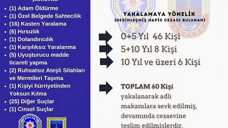 İl Emniyet Müdürlüğü ve İl Jandarma Komutanlığı ekiplerince, 01-31 Ocak tarihleri arasında aranan şahıslara yönelik operasyonlar gerçekleştirildi. Çalışmalar sonucunda, 60 kişinin yakalanarak cezaevine teslim edildiği bildirildi.