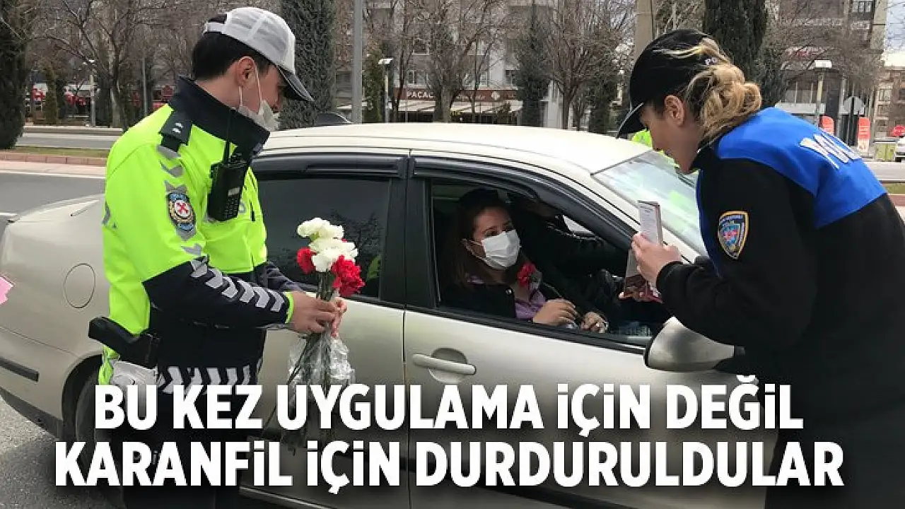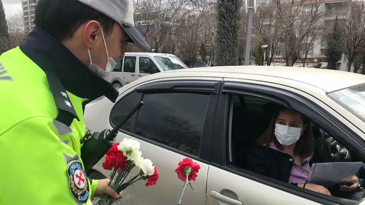 Elazığ İl Emniyet Müdürlüğü ekipleri, 8 Mart Dünya Kadınlar Günü dolayısıyla trafikte yaptıkları uygulamada, kadınları karanfillerle karşıladı.
