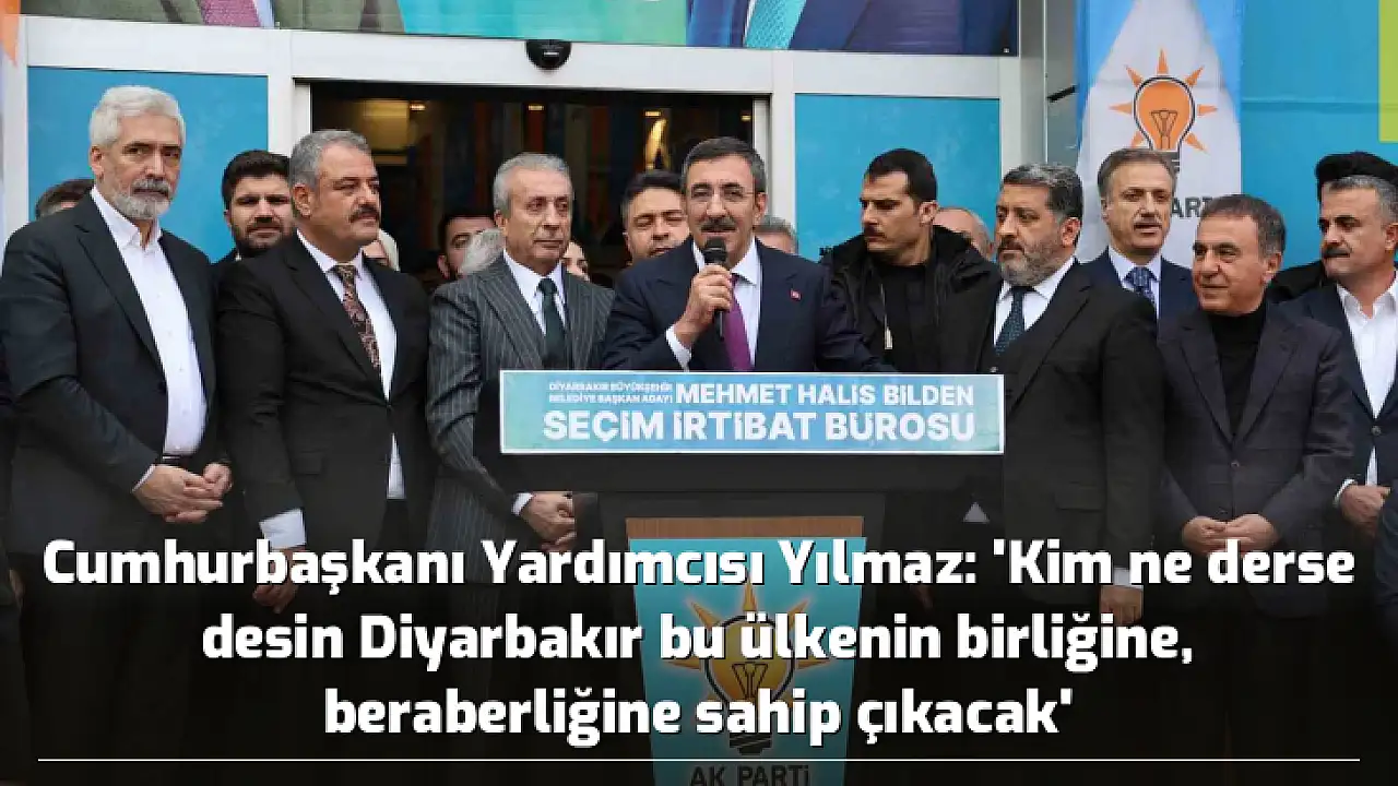 Cumhurbaşkanı Yardımcısı Cevdet Yılmaz, Diyarbakır'da Adalet ve Kalkınma Partisi'nin (AK Parti) Seçim Koordinasyon Merkezi'nin (SKM) açılışına katılarak, 'Kim ne derse desin Diyarbakır bu ülkenin birliğine, beraberliğine sahip çıkacak. Bu vatana, bu bayrağa, bu devlete sahip çıkacak ve emperyalist birtakım güçlerin bu bölge üzerinde kurduğu hesapları boşa çıkaracak' dedi.