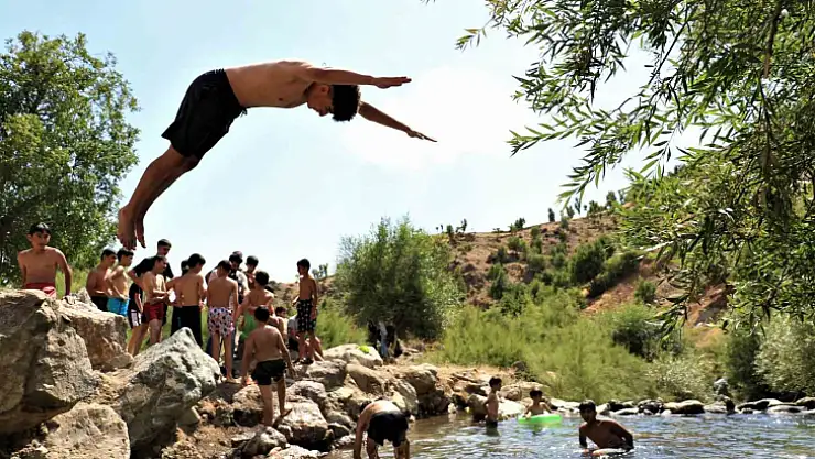 Elazığ'ın Arıcak ilçesindeki dağların eteğinde akan suda serinlemek isteyen çocukların profesyonel yüzücülere taş çıkartacak atlayışları fotoğraf karelerine yansıdı.