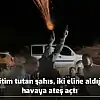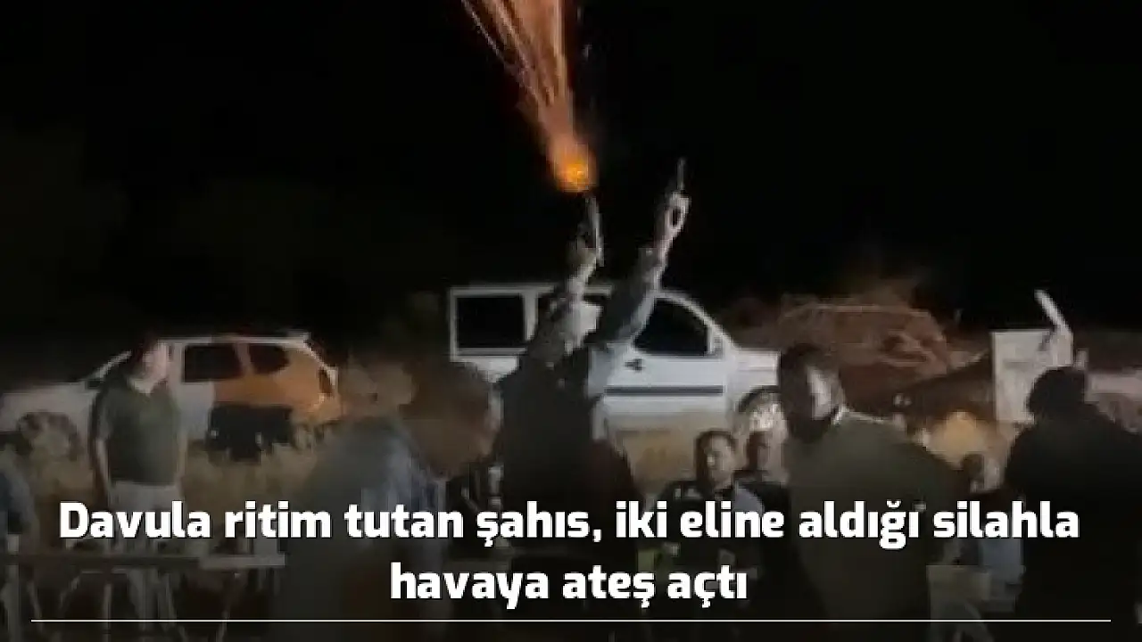 Davula ritim tutan şahıs, iki eline aldığı silahla havaya ateş açtı
