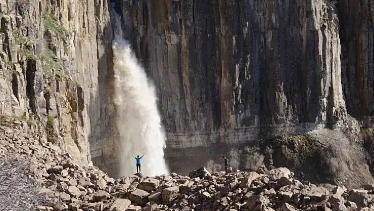 Devasa büyüklükteki kayanın göbeğinden akan şelale, heybeti ve güzelliğiyle ilgi odağı oldu