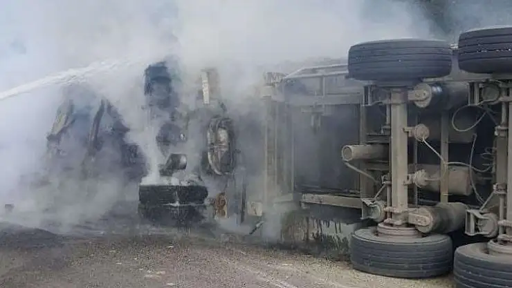 Devrilen tırın sürücüsü çıkan yangında hayatını kaybetti