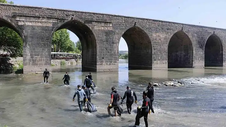 Açıklamaların ardından dalış elbisesi giyen AFAD ekipleri, tarihi köprü içerisinden geçen Dicle Nehri’ne girerek temizlik yaptı.