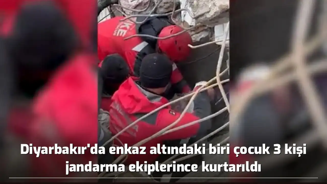 Diyarbakır'da jandarma ekiplerince merkez üssü Kahramanmaraş'ın Pazarcık ilçesi olan ve 10 ili etkileyen 7.7 büyüklüğündeki depremde yıkılan binanın enkazından biri çocuk 3 kişi çıkarıldı.
