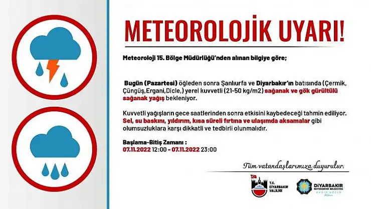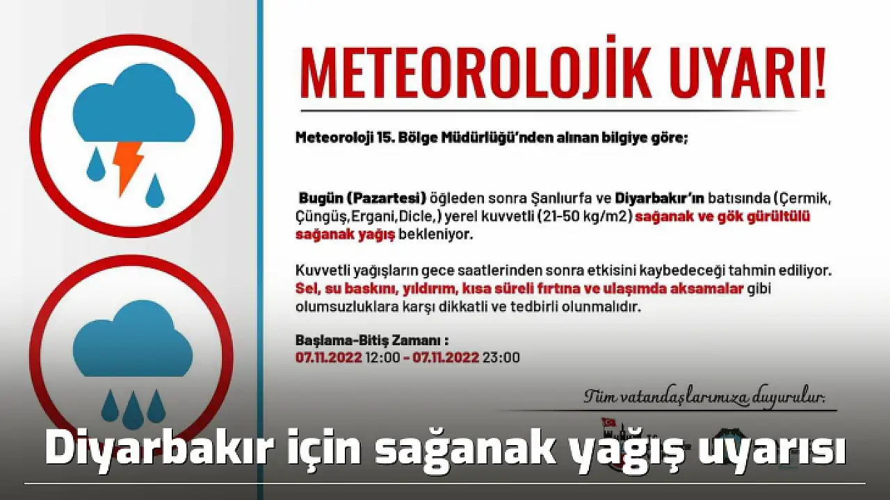 Meteoroloji 15. Bölge Müdürlüğü Diyarbakır ve Şanlıurfa ili için sağanak yağış uyarısında bulundu. Yapılan açıklamada, bugün öğleden sonra Şanlıurfa ve Diyarbakır’ın batısında Çermik, Çüngüş, Ergani, Dicle yerel kuvvetli sağanak ve gök gürültülü sağanak yağış beklendiğini belirtti.