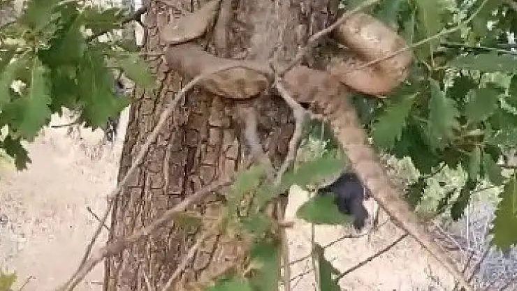 Elazığ'ın Alacakaya ilçesinde koyunları otlatan bir çoban, yaklaşık 2 metre uzunluğundaki yılanı görünce ne yapacağını şaşırdı. Koyunların arasında ilerleyen yılan bir süre sonra ağaca çıkarken, o anlar cep telefonu kamerasına kaydedildi.