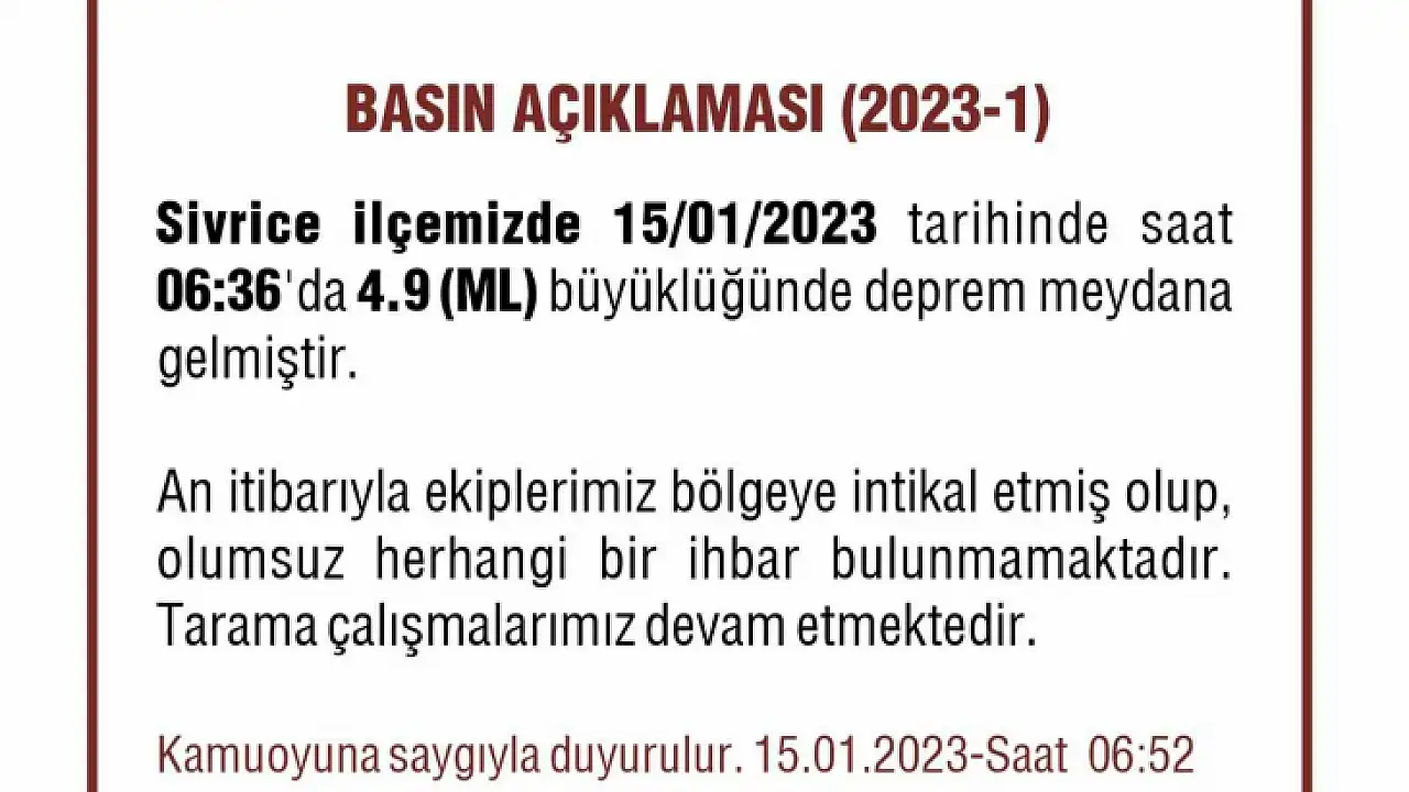 Afet ve Acil Durum Yönetimi Başkanlığı Deprem Dairesi Başkanlığından alınan bilgiye göre, saat 06.36’de merkez üssü Elazığ’ın Sivrice ilçesinde 4.9 büyüklüğünde deprem meydana geldi. Yerin yaklaşık 17 kilometre derinliğinde meydana gelen depremle ilgili olumsuz bir durum yaşanmadığı öğrenildi.