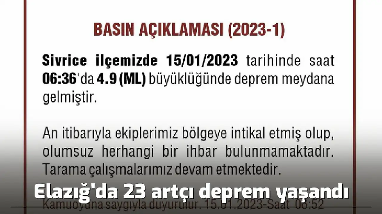 Elazığ’da meydana 4.9 büyüklüğündeki depremin ardından 23 tane artçı yaşandı.
