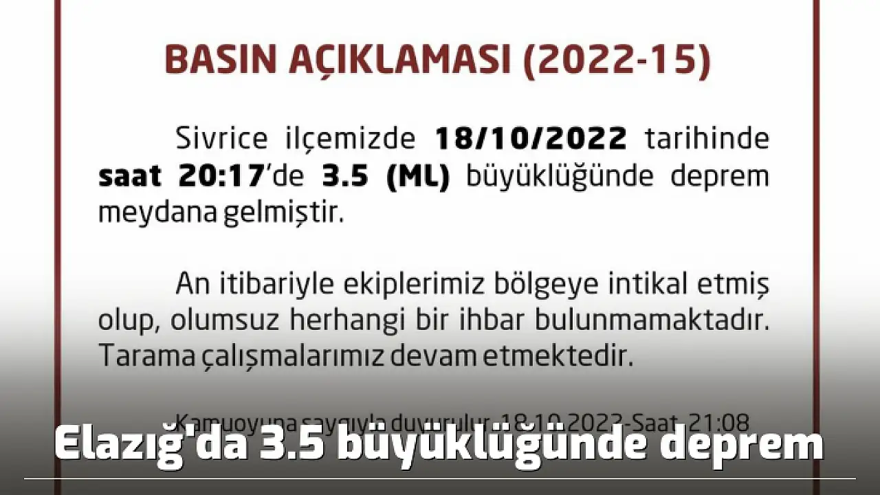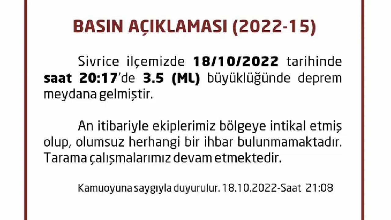 Elazığ Valiliği tarafından yapılan açıklamada, “Sivrice ilçemizde 18 Ekim 2022 tarihinde saat 20.17de 3.5 büyüklüğünde deprem meydana gelmiştir. An itibariyle ekiplerimiz bölgeye intikal etmiş olup, olumsuz herhangi bir ihbar bulunmamaktadır. Tarama çalışmalarımız devam etmektedir" denildi.