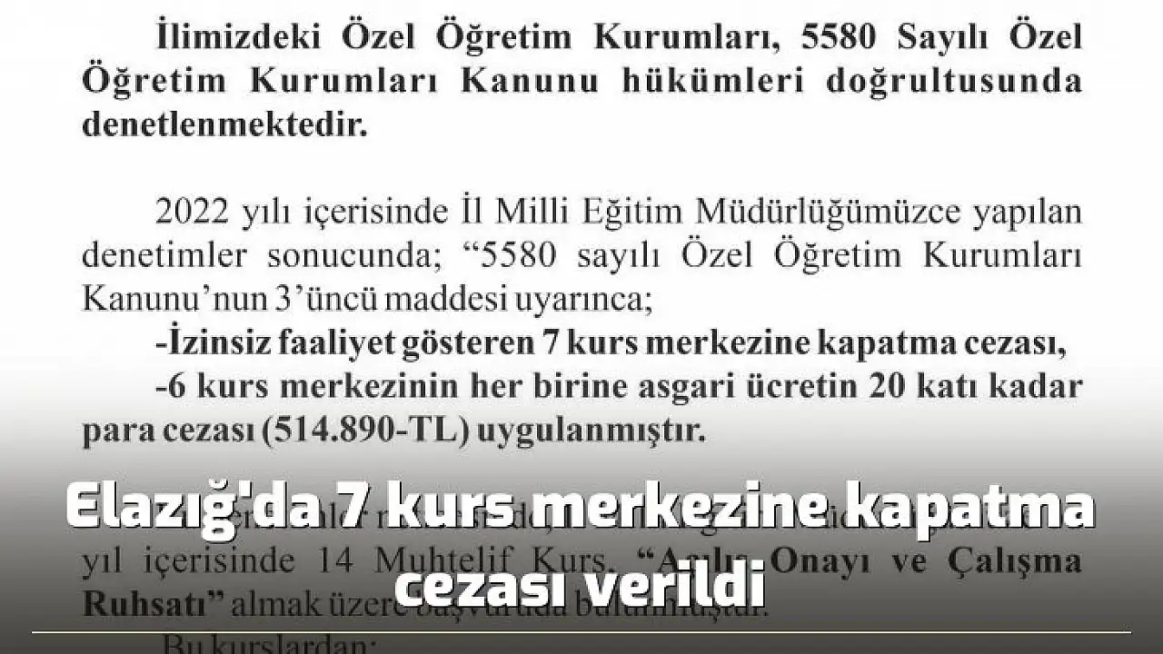 Elazığ'da 7 kurs merkezine kapatma cezası verilirken, 6 kurs merkezine ise 514 bin 890 TL para cezası kesildi.