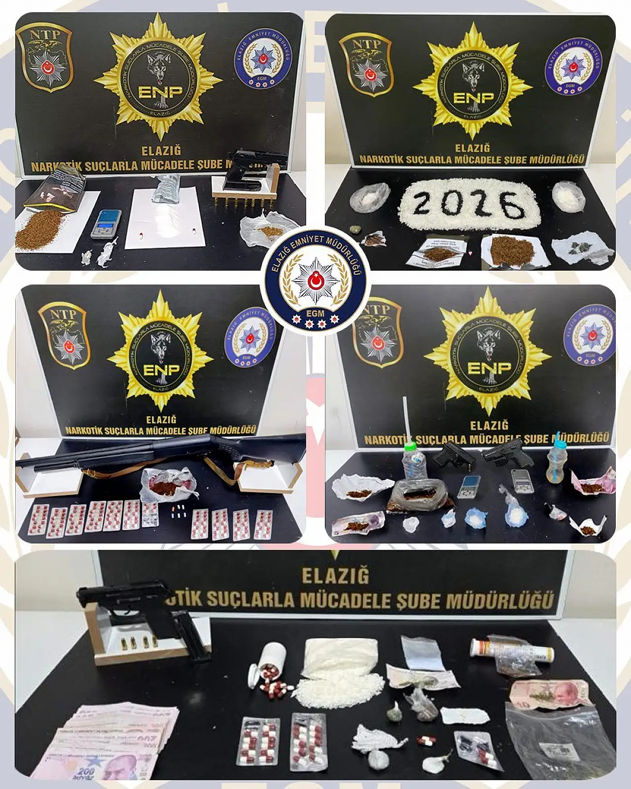 Elazığ İl Emniyet Müdürlüğü'nün narkotik ve asayiş birimlerince yılbaşından bu yana yürütülen operasyonlarda uyuşturucu maddeler ile ruhsatsız silahlar ele geçirildi. Operasyonlarda 17 şüpheli tutuklandı, çok sayıda kişi hakkında adli işlem yapıldı.