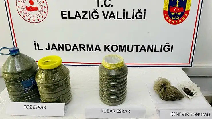 Elazığ İl Jandarma Komutanlığınca bölgede huzur ve güvenin sağlanması maksadıyla yapılan istihbari çalışmalar sonucunda M.K. isimli şüphelinin uyuşturucu madde bulundurduğu bilgisine ulaşıldı. Kaçakçılık ve Organize Suçlarla Mücadele Şube Müdürlüğünce şüpheli şahıs yakalanarak uyuşturucu maddeyi sakladığı yerde yapılan arama sonucunda, 10 kilogram toz esrar, 4 kilogram kubar esrar, 145 gram kenevir tohumu ele geçirildi.