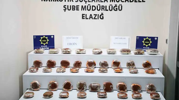 Elazığ'da polis ekipleri tarafından yapılan çalışmada, pirinç paketlerinin içerisine salça ile streçlenmiş vaziyette 28 kilo 505 gram eroin ve 1 kilo 2 gram metamfetamin ele geçirildi.