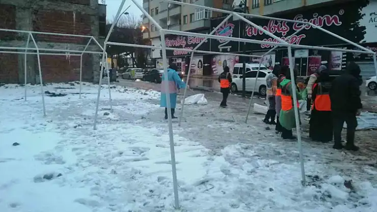 Öte yandan kar ve yağmurun etkili olduğu şehirde, enkaz alanı bölgesine ekipler tarafından çadır kurulmaya başlandı.