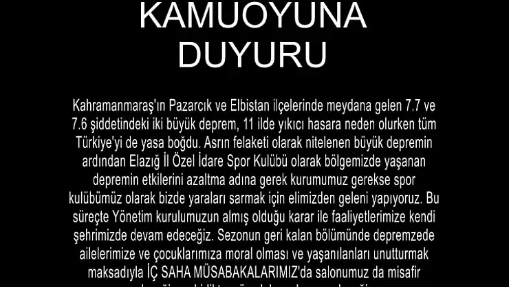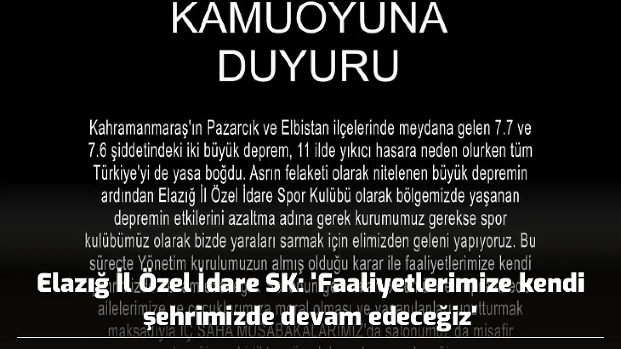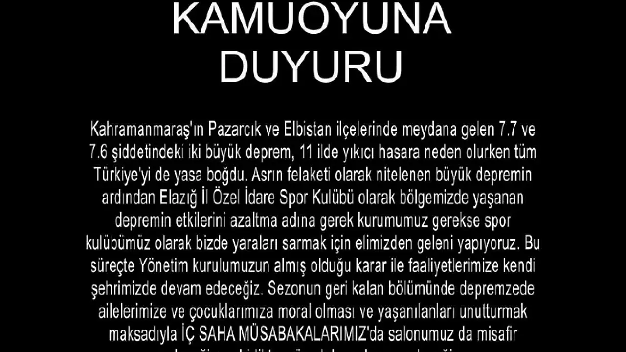 Türkiye Kadınlar Basketbol Ligi ekiplerinden Elazığ İl Özel İdare, yaşanan deprem felaketi sonrası yönetim kurulunun aldığı kararla faaliyetlerine Elazığ’da devam etme kararı aldı. Konuya ilişkin olarak kulüpten yapılan açıklamada, “Kahramanmaraş’ın Pazarcık ve Elbistan ilçelerinde meydana gelen 7.7 ve 7.6 büyüklüğündeki iki deprem, 11 ilde yıkıcı hasara neden olurken tüm Türkiye’yi de yasa boğdu. Asrın felaketi olarak nitelendirilen büyük depremin ardından Elazığ İl Özel İdare Spor Kulübü olarak bölgemizde yaşanan depremin etkilerini azaltma adına gerek kurumumuz gerekse spor kulübümüz olarak bizde yaraları sarmak için elimizden geleni yapıyoruz. Bu süreçte yönetim kurulumuzun almış olduğu karar ile faaliyetlerimize kendi şehrimizde devam edeceğiz. Sezonun geri kalan bölümünde depremzede ailelerimize ve çocuklarımıza moral olması ve yaşanılanları unutturmak maksadıyla iç saha müsabakalarımızda salonumuzda misafir edeceğiz ve birlikte mücadeleye devam edeceğiz. Biz birlikte güçlüyüz. Haydi Elazığ birlik olma zamanı, birbirimize sahip çıkma zamanı” ifadeleri kullanıldı.