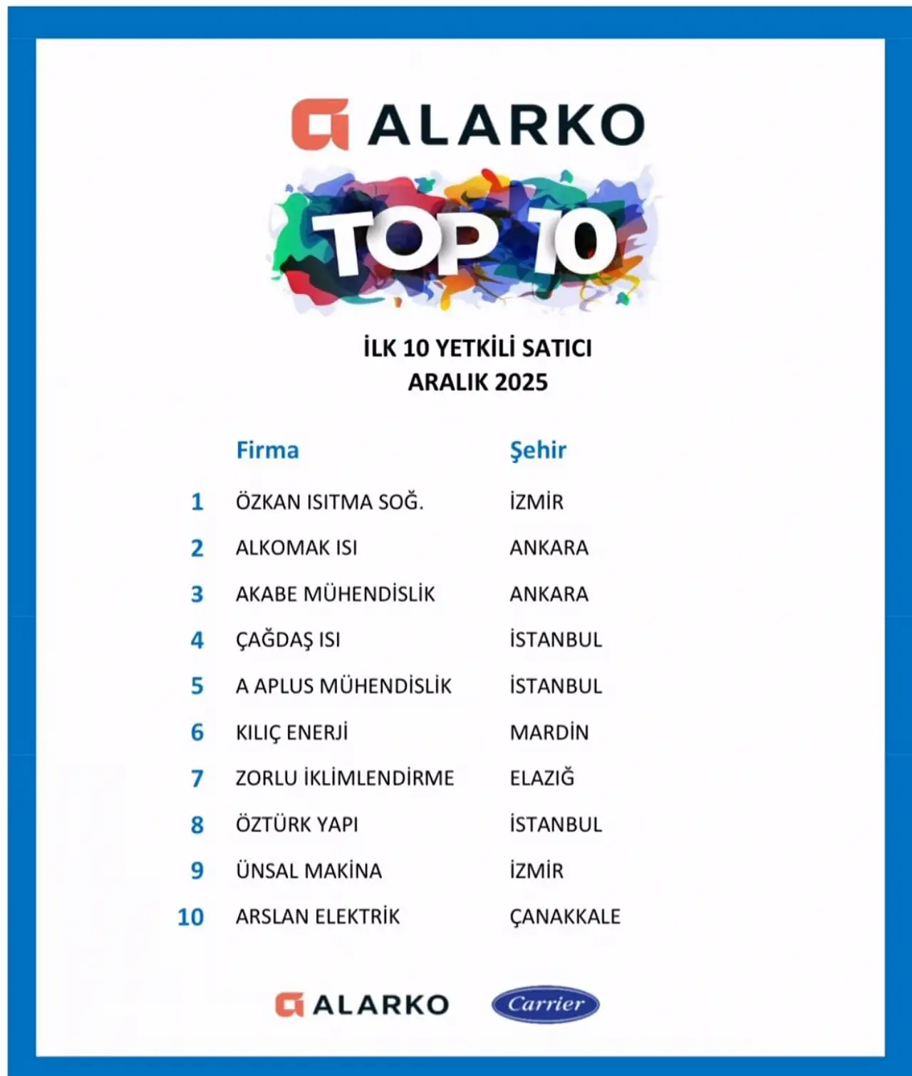 Alarko tarafından yapılan değerlendirmede; satış hacmi, satış sonrası hizmetler, teknik servis süreçleri ve müşteri geri bildirimleri dikkate alındı. Sıralamanın, yıl boyunca elde edilen veriler üzerinden oluşturulduğu bildirildi.