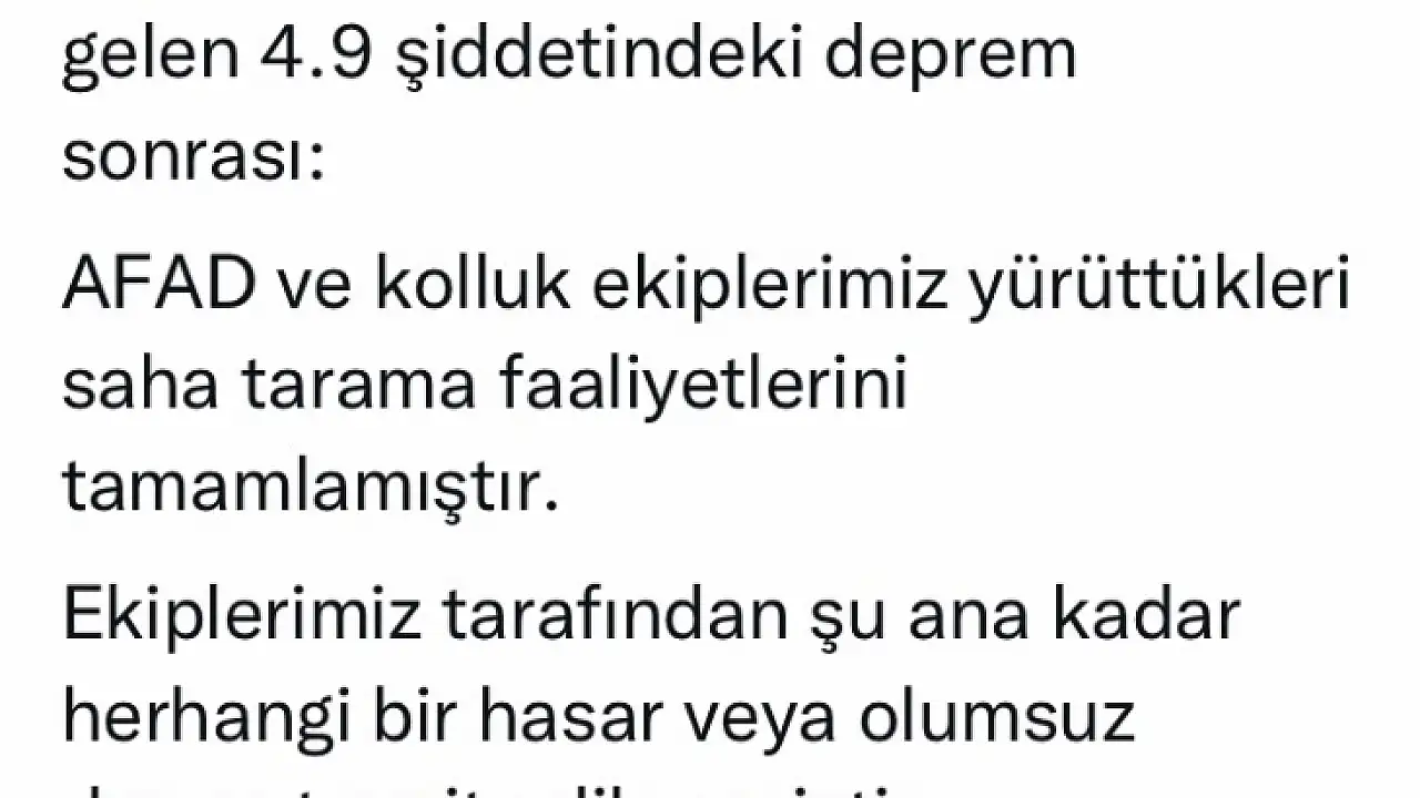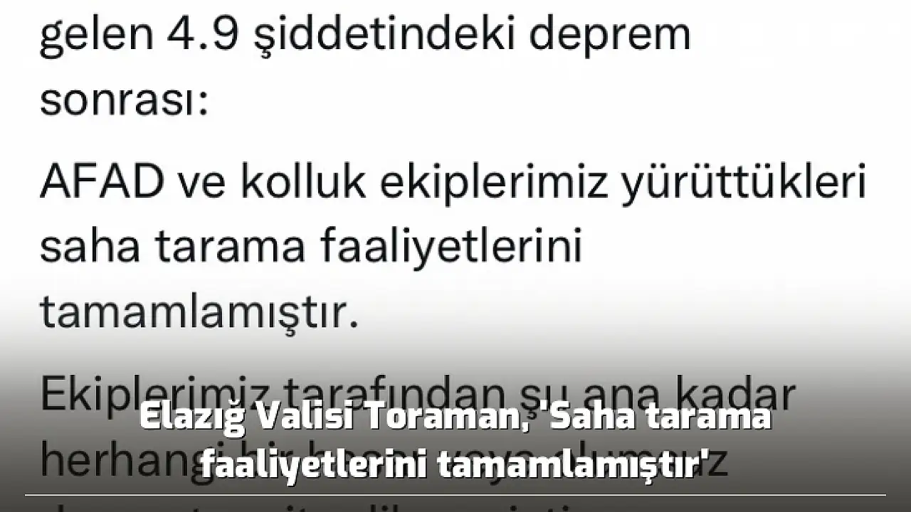 Elazığ'da meydana 4.9 büyüklüğündeki depremin ardından bir paylaşım daha yapan Vali Dr. Ömer Toraman, 'AFAD ve kolluk ekiplerimiz yürüttükleri saha tarama faaliyetlerini tamamlamıştır. Ekiplerimiz tarafından şu ana kadar herhangi bir hasar veya olumsuz durum tespit edilmemiştir' dedi.