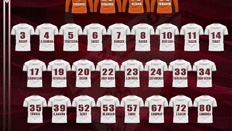 "Yiğit Kafkasyalı (1), Hakan Canbazoğlu (26), Ali Can (78), İbrahim Akdaş (99), Recep Yurdakul (3), Ali Osman Döner (4), Yiğitcan Erdoğan (5), Hasan Ekici (6), Hakkı İsmet Şimşek (7), Cafer Tosun (8), Mesut Saray (10), Salih Polatdemir (11), Fırat Ergün (14), Abdullah İçen (17), Feyzullah Şahin Güneş (19), Selim Enes Özeren (20), Eray Berk Şimşek (22), Ahmet Ertuğrul Öztürk (23), Zeki Korkmaz (24), Yağızcan Erdem (33), Ömer Faruk Sezgin (34), Yüksel Kayaalp (35), Emre Akgün (39), İzzet Topatar (52), M. Ensar Çavuşoğlu (53), Emre Yıldız (57), Cihan Canpolat (67), İbrahim İşler (72), Ahmet Ormanoğlu (80)."