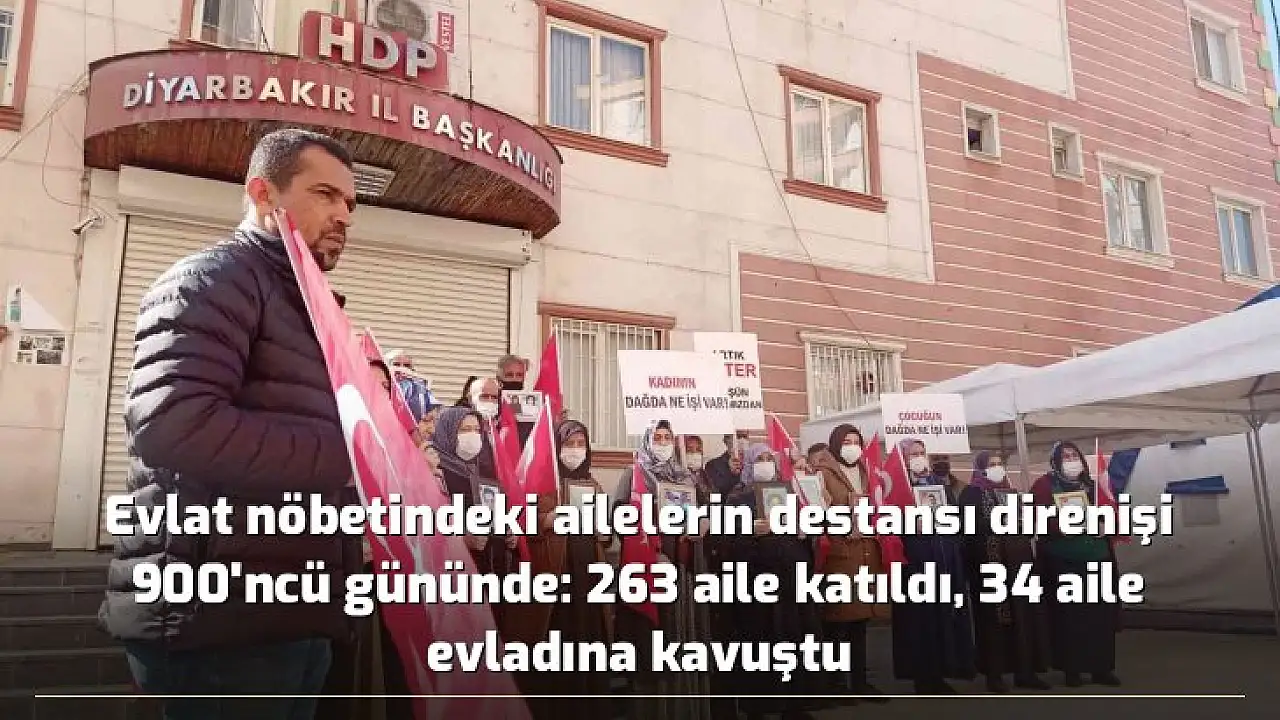 Çocuklarının terör örgütü PKK mensupları tarafından dağa kaçırıldığı iddiasıyla HDP Diyarbakır il başkanlığı önünde evlat nöbeti tutan ailelerin direnişi 900. gündür sürüyor. 263 ailenin katıldığı destansı evlat nöbetinde 34 aile evladına kavuştu.