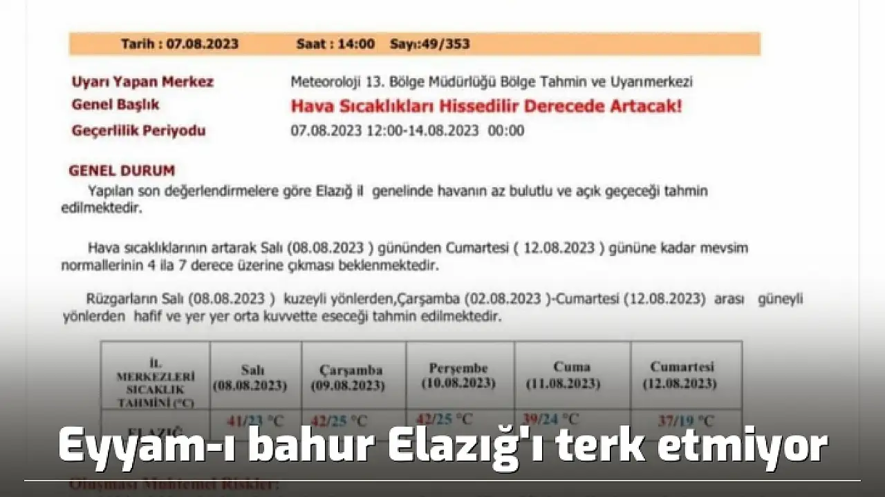 Meteoroloji 13. Bölge Müdürlüğü Bölge Tahmin ve Uyarı Merkezinden yapılan açıklamada, hava sıcaklıklarının yarından itibaren hissedilir düzeyde artacağı belirtildi. Açıklamada, "Yapılan değerlendirmelere göre, Elazığ il genelinde havanın az bulutlu ve açık geçeceği tahmin edilmektedir. Hava sıcaklıklarının artarak salı gününden cumartesi gününe kadar mevsim normallerinin 4 ila 7 derece üzerine çıkması beklenmektedir. Sıcaklıkların yükselişe bağlı olarak güneş ışınlarının dik geldiği saat 11.00 ile 16.00 saatleri arasında başta yaşlılar, çocuk ve kronik rahatsızlığı olan vatandaşlarımızın sıcak çarpmasına karşı dikkatli ve tedbirli olmaları önem arz etmektedir" denildi.