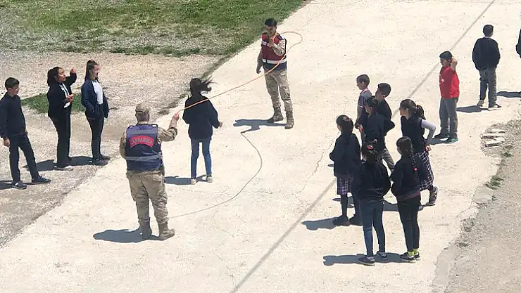 Maden ilçesine bağlı Gezin köyünde jandarma karakol komutanı, Vali Aydın Arslan Ortaokulu’nu ziyaret etti. Ziyaret sırasında astsubay ve uzman çavuşlar, okulun bahçesinde oyun oynayan öğrencilere eşlik etti. Jandarma görevlileri ipi çevirirken, öğrenciler de atladı.