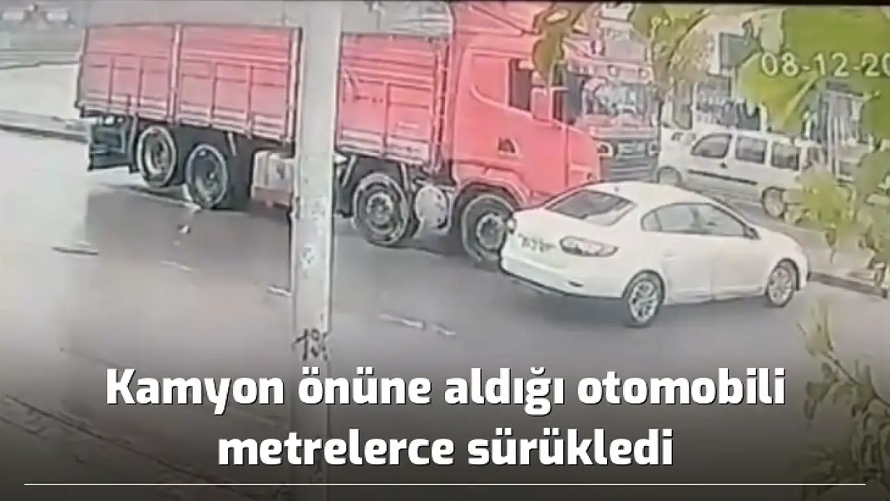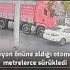Kamyon önüne aldığı otomobili metrelerce sürükledi