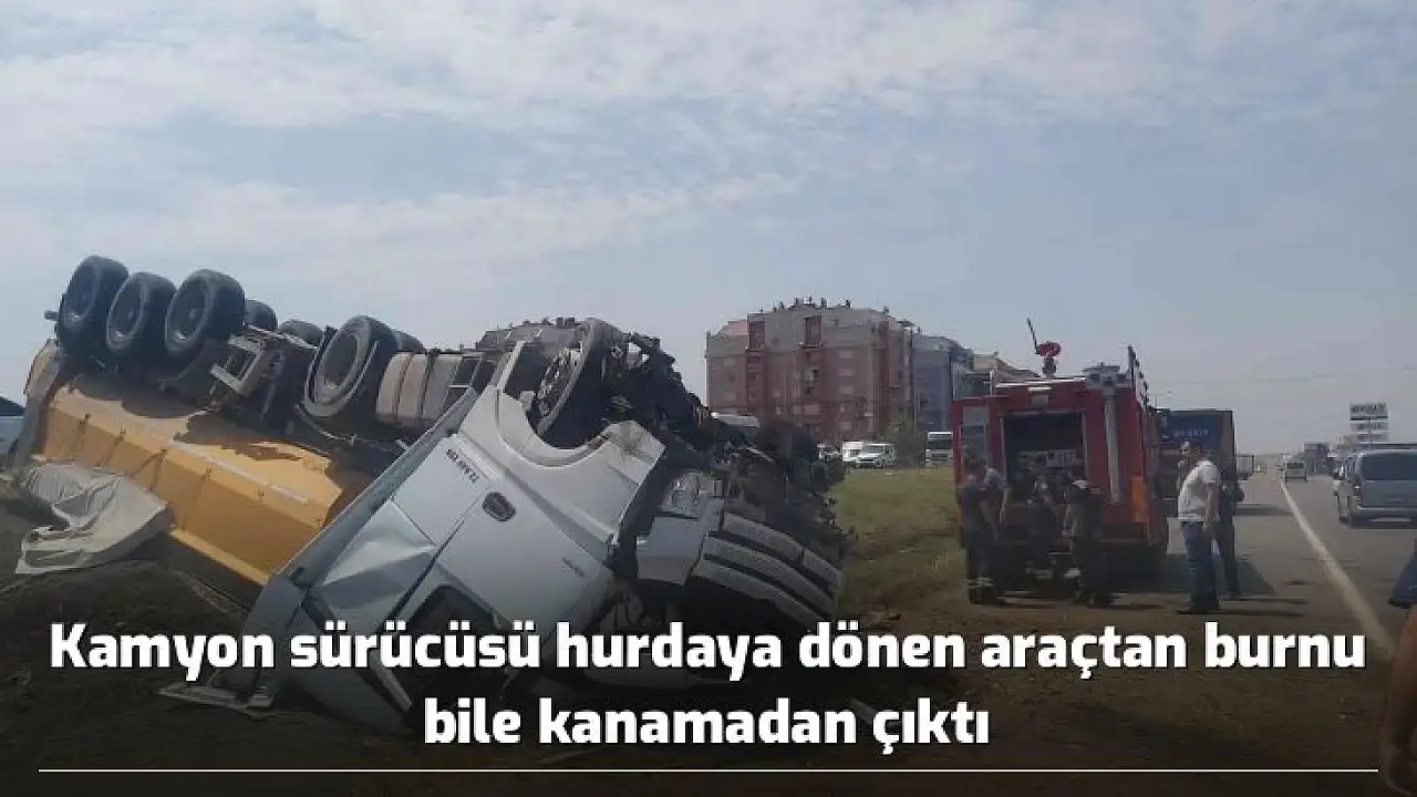 Diyarbakır'ın Bismil ilçesinde devrilen kum yüklü kamyonunun sürücüsü araçtan burnu bile kanamadan çıktı.